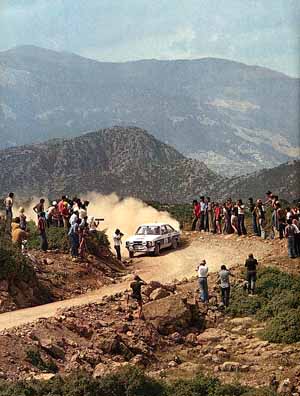 Το “Ακροπολικό σκηνικό” στα μέσα ακριβώς της δεκαετίας του 1970: η Lancia Stratos των Βάλντεγκαρντ –Τορζέλιους, με τις σχάρες από το ράλι Σαφάρι ακόμη πάνω της, παλεύει με τη σκόνη και τις πέτρες του Ακρόπολις.