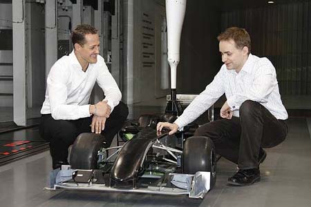 | O Schumacher με το μοντέλο του μονοθεσίου της Mercedes για τις δοκιμές στην αεροδυναμική σήραγγα |