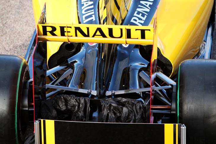 Οι εισαγωγές αέρα των ψυγείων διατηρούν το παραδοσιακό για τη Renault σήμα Ρ (ή Γ) και είναι ακόμη πιο μικρές από τις περυσινές. Υπάρχει σκάψιμο στο κάτω μέρος των καλυμμάτων των ψυγείων, ωστόσο αυτό είναι έντονο μονάχα στο εμπρός μέρος, ενώ στο μέσο του μήκους τους εξαφανίζεται σχεδόν ολοκληρωτικά. Τα καλύμματα των ψυγείων είναι ιδιαίτερα υψηλά. Στο εμπρός μέρος τους υπάρχουν pod wings, που ενώνονται με ένα κάθετο στέλεχος που εκτείνεται μέχρι το πάτωμα του μονοθεσίου.