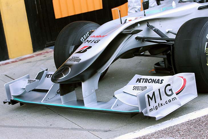 Η MGP W01 παρουσιάζει επιστροφή σε μια λύση που είχαμε να δούμε από το 2006 στη Formula 1: τη μονή καρίνα στο κάτω εμπρός μέρος του monocoque, όπου το κατώτερο ψαλίδι της εμπρός ανάρτησης συναντάει το πλαίσιο. Μέχρι φέτος, αυτή η λύση είχε καταργηθεί, λόγω των αεροδυναμικών μειονεκτημάτων που συνεπαγόταν. Ωστόσο, με τη φετινή τάση ανύψωσης των ρυγχών, ο βαθμός δυσκολίας της κατασκευής των ψαλιδιών εμπρός αναρτήσεων που ανεβαίνουν σημαντικά για να συναντήσουν το πλαίσιο, έχει αυξηθεί αισθητά. Η Mercedes, με την επιλογή της, επιτρέπει στο ρύγχος να είναι ιδιαίτερα ανυψωμένο, χωρίς να παρουσιάζονται κατασκευαστικά και γεωμετρικά προβλήματα στο σχεδιασμό της εμπρός ανάρτησης, η οποία παρουσιάζει μονοκόμματο κατώτερο τρίγωνο ψαλιδιών. Με δεδομένο ότι η μονή καρίνα είναι πολύ μικρών διαστάσεων, το εξ' ορισμού αεροδυναμικό μειονέκτημα είναι αμελητέο.