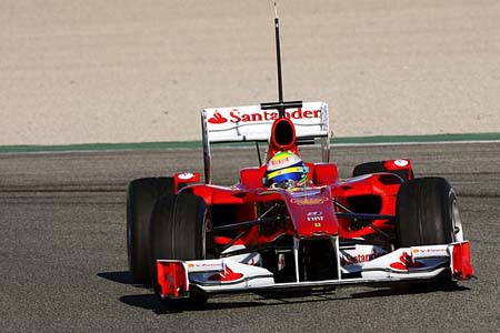 O Felipe Massa, με την καινούργια Ferrari F10 βρισκόταν στην κορυφή των χρόνων σχεδόν ολόκληρο το πρωί. Το απόγευμα, ο de la Rosa διατηρούσε για αρκετή ώρα τον ταχύτερο χρόνο, ωστόσο έπειτα από μια κόκκινη σημαία που άφησε 10 λεπτά στο τέλος για γύρους με λίγα καύσιμα, η κατάταξη άλλαξε ξανά, με τον Βραζιλιάνο να αναδεικνύεται "νικητής" της πρώτης, άτυπης αναμέτρησης 7 καινούργιων μονοθεσίων. Ο Massa σταμάτησε τα χρονόμετρα στο 1:12.574 στην καλύτερη επίδοσή του (στο 12ο γύρο ενός stint 14), συμπληρώνοντας συνολικά 102 γύρους (τους περισσότερους από οποιονδήποτε άλλο οδηγό). Ο Βραζιλιάνος επικεντρώθηκε στην κατανόηση των καινούργιων ελαστικών της Bridgestone και την εύρεση ενός βασικού στησίματος για την F10, η οποία έφερε καινούργια ανώτερα στοιχεία στην εμπρός αεροτομή της. Η Ferrari F10 έδειχνε ότι έχει τα φόντα να γίνει ιδιαίτερα ανταγωνιστική, καθώς τα μεγάλα stint του Massa ήταν αρκετά καλά. Ο Βραζιλιάνος έκανε ένα αρκετά μακρύ stint αρκετά νωρίς στην ημέρα με τους χρόνους του να κυμαίνονται στα μέσα με χαμηλά 1:13 και αργότερα, ένα stint 10 γύρων, με το χρονόμετρο κολλημένο στα χαμηλά 1:13. Ο Massa δήλωσε ότι ήταν μια θετική ημέρα, με το μονοθέσιο να συμπεριφέρεται καλά και αποκάλυψε ότι είχε τη δυνατότητα να συμπληρώσει περισσότερους γύρους από όσους είχε αρχικά προγραμματιστεί να διαγράψει. Ο Βραζιλιάνος δήλωσε επίσης ότι η F10 του φάνηκε πιο εύκολη στην οδήγηση από το περυσινό μονοθέσιο της Scuderia, στο οποίο ήταν πολύ δύσκολο να βρεθεί το ιδανικό ζύγισμα. Με την F10, ο Massa δήλωσε ότι η εύρεση του κατάλληλου στησίματος και ζυγίσματος του φάνηκε πιο εύκολη, με τα ελαστικά να μην παρουσιάζουν προβλήματα. Ο Massa δεν αντιμετώπισε κανένα πρόβλημα με τη φυσική του κατάσταση και δήλωσε ότι θα μπορούσε να κάνει κι άλλους πολλούς γύρους. Η πρώτη εντύπωση του Βραζιλιάνου από την F10 ήταν θετική και δήλωσε ότι ολοκλήρωσε το σημερινό πρόγραμμά του πολύ εύκολα. Υπάρχουν φήμες που θέλουν τη Ferrari να μην είναι ικανοποιημένη με την αεροδυναμική απόδοση της F10 και να ετοιμάζει ήδη μια δεύτερη έκδοσή της. Ωστόσο, άλλες πηγές αντικρούουν τον ισχυρισμό αυτό, αναφέροντας ότι η Ferrari προσέλαβε έναν υψηλόβαθμο αεροδυναμιστή από την Toyota, ο οποίος έφερε μαζί του την τεχνογνωσία για τη δημιουργία ενός επαναστατικού διαχύτη, με οπή μεγέθους κόλλας Α3 στο πάτωμα του μονοθεσίου να τροφοδοτεί το επάνω επίπεδό του. Υπάρχει πιθανότητα η Ferrari να δημιουργεί μια βελτιωμένη έκδοση της F10 γύρω από αυτόν το διαχύτη, ίσως και για το Grand Prix του Μπαχρέιν, που ανοίγει τη φετινή σεζόν. Όσον αφορά τις δοκιμές, ο Massa θα οδηγήσει και αύριο την F10, για να παραδώσει το τιμόνι στον Fernando Alonso την Τετάρτη.