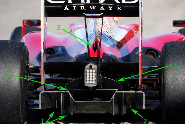 Ο διαχύτης της Ferrari F10 εκτείνεται στα άκρα του στο μέγιστο που επιτρέπουν οι κανονισμοί, διαθέτοντας δυο πλευρικά κανάλια σε κάθε πλευρά (1), το εξωτερικό διαχωρισμένο στη μέση, αλλά όχι μέχρι το πίσω μέρος (2). Το κεντρικό μέρος του έχει τρία επίπεδα, με τα δυο ανώτερα να τροφοδοτούνται από διαφορετικές οπές στο πάτωμα. Το μεσαίο έχει σχήμα τραπεζοειδούς (3), ενώ το ανώτερο τοξοειδές (4). Επίσης, για την εξαγωγή του θερμού αέρα, υπάρχει μια μικρή οπή στην ουρά του καλύμματος του κινητήρα (5).