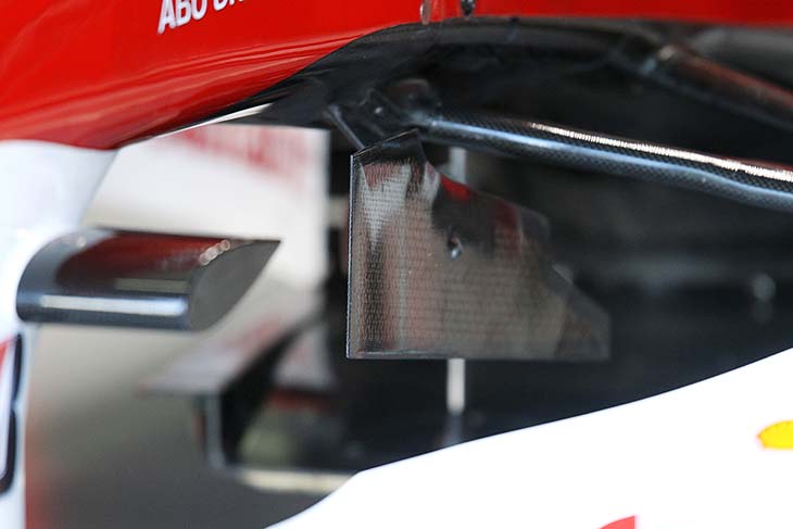Mια φωτογραφία εστιασμένη στα αεροδυναμικά βοηθήματα που χρησιμοποιεί η Ferrari στην περιοχή κάτω από τα ψαλίδια της εμπρός ανάρτησης, για να κατευθύνει καλύτερα τον αέρα κάτω από το mocoque.
