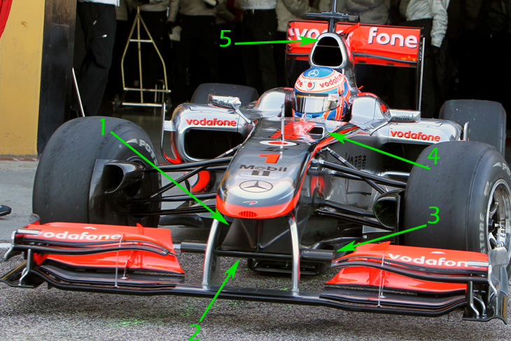Εντυπωσιακό είναι το διαχωριστικό ροής αέρα που φέρει η McLaren κάτω από το ρύγχος της, πίσω από τα υποστηρίγματα της εμπρός αεροτομής (1). Πρόκειται για πρωτοποριακή τοποθέτηση ενός εξαρτήματος που συνήθως βλέπουμε στην περιοχή κάτω από τα πόδια του οδηγού, στο εμπρός μέρος του πατώματος του μονοθεσίου. Το επίπεδο κάτω μέρος του διαχωριστικού (που ανεβαίνει προς τα πίσω, μέχρι να συναντήσει το εμπρός μέρος του monocoque) βρίσκεται στο μέσο του ύψους των υποστηριγμάτων της εμπρός αεροτομής (2) και οι τηλεοπτικές κάμερες λειτουργούν ως προεκτάσεις του επιπέδου αυτού (3). Επίσης, λίγο εμπρός από το άνοιγμα του cockpit, υπάρχει μια μικροσκοπική εισαγωγή αέρα (4), που σίγουρα παρουσιάζει αεροδυναμικά μειονεκτήματα, ωστόσο θα είναι απαραίτητη για την ψύξη εσωτερικών συστημάτων. Ο αεραγωγός του κινητήρα έχει ένα οριζόντιο διαχωριστικό στο επάνω μέρος του. Το επάνω κανάλι (5) τροφοδοτεί με αέρα το ψυγείο λαδιού, το οποίο είναι τοποθετημένο πίσω από τον κινητήρα στην MP4-25, έτσι ώστε τα καλύμματα των ψυγείων να έχουν μικρότερο όγκο.