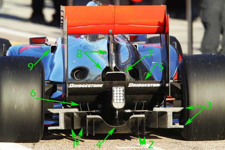 Eντυπωσιακός είναι και ο τεράστιος διαχύτης της McLaren, ο οποίος παρουσιάζει δυο εξωτερικά κάθετα κανάλια (1) και μικρά διαχωριστικά (2) στα εξωτερικά τμήματα του κατώτερου κεντρικού. Τα άκρα του διαχύτη παρουσιάζουν οριζόντιες προεκτάσεις (3) για τη δημιουργία οριζόντιων καναλιών πέραν των διαστάσεών του. Το κεντρικό τμήμα παρουσιάζει τρία κανάλια, με τα δυο ανώτερα να τροφοδοτούνται από διαφορετικές οπές στο πάτωμα. Το μεσαίο έχει κοίλο κάτω μέρος (4) και είναι αρκετά μικρού μεγέθους, ενώ το επάνω υπερμέγεθες ανώτερο κανάλι έχει για οροφή το κατώτερο πτερύγιο της πίσω αεροτομής (5). Υπάρχουν δυο κεκλιμένα καμπυλωτά κανάλια που διαπερνάνε και τα δυο ανώτερα επίπεδα (6). Πάνω από το κατώτερο πτερύγιο της πίσω αεροτομής στο κέντρο, επάνω από τη διάταξη απορρόφησης συγκρούσεων, υπάρχει ένα μικρό πτερύγιο (7). Δυο ανοίγματα (8) υπάρχουν στην ουρά του καλύμματος του κινητήρα για την εξαγωγή θερμού αέρα. Στη φωτογραφία φαίνονται και οι μικροσκοπικές τριγωνικές εξαγωγές αέρα (9) στο πίσω μέρος των προστατευτικών του κεφαλιού του οδηγού.