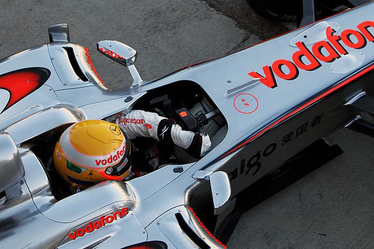 Στη φωτογραφία φαίνονται οι τριγωνικές εξαγωγές αέρα στο πλάι του πίσω μέρους των προστατευικών του κεφαλιού του οδηγού. Διακρίνεται επίσης το εμπρός μέρος του πατώματος της MP4-25 (κάτω από τα πόδια του οδηγού) με τα ανυψωμένα άκρα και το κεντρικό κάθετο στήριγμα.