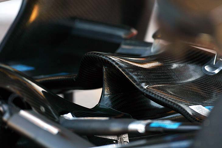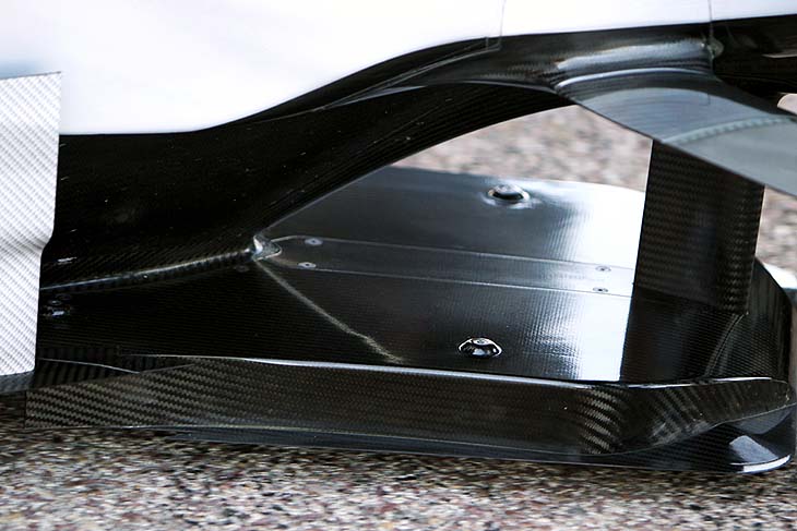 Λεπτομέρεια του ανασηκωμένου κεντρικού μέρους του κατώτερου πτερυγίου της πίσω αεροτομής της Μercedes. Από κάτω διαφαίνεται ένα κάθετο διαχωριστικό ροής αέρα.
