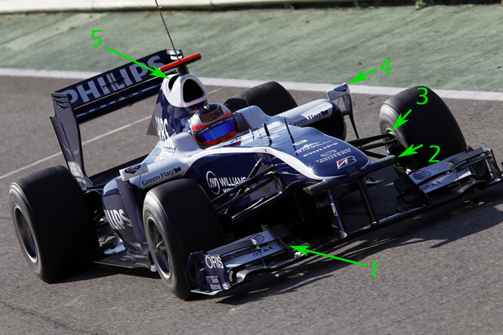 H εμπρός αεροτομή της Williams είναι σχεδόν ίδια με αυτήν που χρησιμοποιούσε η ομάδα στους τελευταίους αγώνες του 2009 (η οποία είχε πάρει αρκετές ιδέες από αυτήν της Brawn), με την προσθήκη δυο κάθετων επιφανειών στο εσωτερικό των πτερυγίων (1), για την καλύτερη διαχείριση του αέρα. Η Williams έχει τοποθετήσει τις τηλεοπτικές κάμερες (2) στα άκρα του υπερυψωμένου ρύγχους (όπως η Red Bull πέρυσι), όπου λειτουργούν σαν πτερύγια. Tα ψαλίδια της ανάρτησης, λόγω του υπερυψωμένου ρύγχους, στηρίζονται αρκετά ψηλά στην πλήμνη των τροχών (3). Οι καθρέπτες (4) στηρίζονται στα pod wings (για να μην εμποδίζουν τη ροή αέρα προς την πίσω αεροτομή) αλλά έχουν και ένα μικρό υποστήριγμα που στηρίζεται στο κάλυμμα των ψυγείων. Η Williams έχει διπλή εισαγωγή αέρα επάνω από το κεφάλι του οδηγού. Πέρυσι, πέραν της βασικής εισαγωγής που τροφοδοτεί τον κινητήρα, υπήρχαν και δυο μικρές στα πλαϊνά. Φέτος, η δεύτερη εισαγωγή (5) είναι μονοκόμματη και βρίσκεται πίσω από τη βασική.