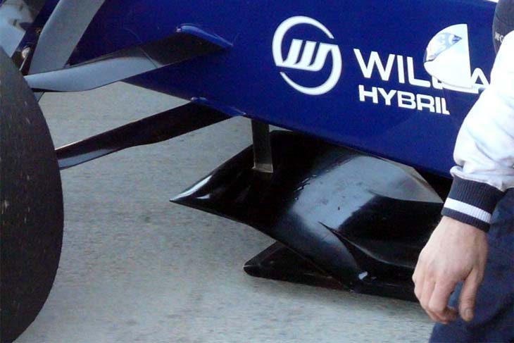 Iδιαίτερο ενδιαφέρον παρουσιάζει το εμπρός μέρος του πατώματος της καινούργιας Williams, το οποίο θυμίζει την αντίστοιχη περυσινή λύση της Brawn. O διαχωρισμός του αέρα πραγματοποιείται από ένα ανασηκωμένο καμπυλωτό στοιχείο, το οποίο διαθέτει στήριγμα που το ενώνει με το monocoque.