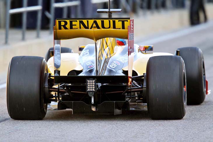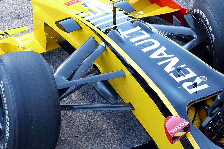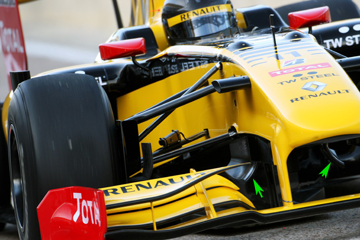 Τα πλευρικά τοιχώματα της εμπρός αεροτομής της Renault είναι πιο περίπλοκα από τα περυσινά, κατευθύνοντας τον αέρα προς το εξωτερικό των ελαστικών με μια μετωπική επιφάνεια στο πίσω μέρος τους. Το οριζόντιο τμήμα τους φέρει ένα μικροσκοπικό τούνελ Venturi. Στο εξωτερικό αυτών, υπάρχει μια στενόμακρη οπή, για μικρότερη αεροδυναμική αντίσταση.