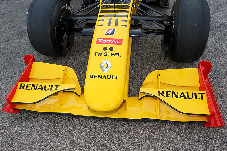 Καινούργιο ρύγχος και εμπρός αεροτομή έφερε η Renault μια ημέρα μετά την παρουσίασή της. Το ρύγχος έχει μικρότερη μετωπική επιφάνεια από το περυσινό, αλλά διατηρεί τις κάθετες επιφάνειες στα άκρα του κάτω μέρους του (για τη δημιουργία ενός τούνελ Venturi), τα οποία στο πίσω μέρος τους (στην περιοχή κάτω από τα ψαλίδια της εμπρός ανάρτησης) έχουν μεγαλύτερο ύψος και κλίνουν προς τα έξω (βέλη). Η εμπρός αεροτομή διαθέτει τρία πτερύγια, εκ των οποίων το κατώτερο κλίνει προς τα πάνω στο κάτω εξωτερικό του μέρος (αντίθετα με το περυσινό που έκλινε προς τα επάνω). Στο εσωτερικό τους μέρος τα πτερύγια φέρουν μια κάθετη επιφάνεια, για την καλύτερη διαχείριση του αέρα. Το μέγιστο δυνατό πλάτος έχουν τα κοίλα ανώτερα στελέχη της εμπρός αεροτομής, τα οποία φέρουν υποστήριγμα και ανεβαίνουν προς το εσωτερικό του μονοθεσίου. Στη φωτογραφία, στηριγμένος επάνω σε ένα από τα ψαλίδια της ανάρτησης, διακρίνεται και ένας αισθητήρας, που συλλέγει πληροφορίες για την κατάσταση των ελαστικών.