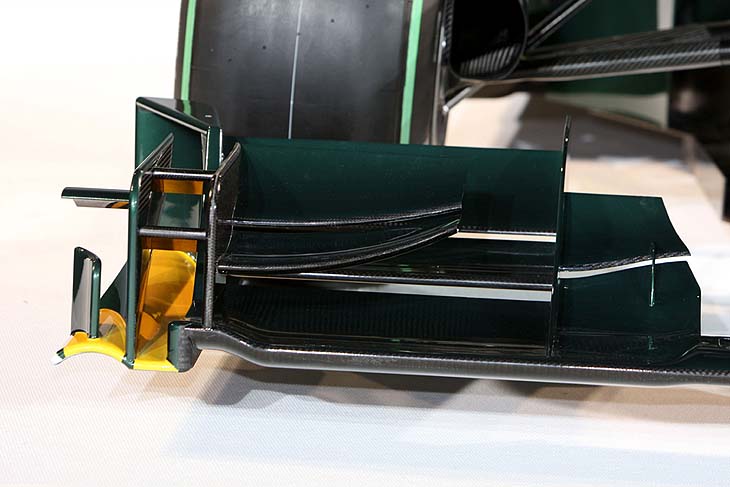 To ρύγχος είναι ιδιαίτερα ανασηκωμένο και λεπτό, ενώ στην εμπρός ανάρτηση τα ψαλίδια καταλήγουν κατευθείαν στο κάτω μέρος του πλαισίου. Κάτω από αυτή την περιοχή υπάρχουν δυο αεροδυναμικά βοηθήματα. Η προέκταση του πατώματος, με το διαχωριστικό ροής αέρα με στήριγμα, έχει ανασηκωμένα άκρα. Απλά είναι τα barge boards και τα pod wings, που κλίνουν προς το εσωτερικό στο κάτω μέρος του. Πολύ μεγάλες οι εισαγωγές αέρα των ψυγείων, με μικρό σκάψιμο από κάτω τους. Τα καλύμματα των ψυγείων είναι αρκετά ογκώδη και χαμηλώνουν ελάχιστα στο πίσω μέρος τους. Αρκετά καλυμμένες είναι οι εξατμίσεις, με μονάχα ένα μικρό εξόγκωμα επάνω από την κάθε απόληξή τους. Κλασικό είναι το κάλυμμα του κινητήρα που φέρει μικρό πτερύγιο ράχης, απλά για να πληροί τις ελάχιστες διαστάσεις. Η πίσω αεροτομή είναι παραδοσιακή, ενώ ο διαχύτης δυο επιπέδων έχει σχήμα V στο κέντρο του. Το ανώτερο επίπεδό του έχει πολύ μικρό ύψος.