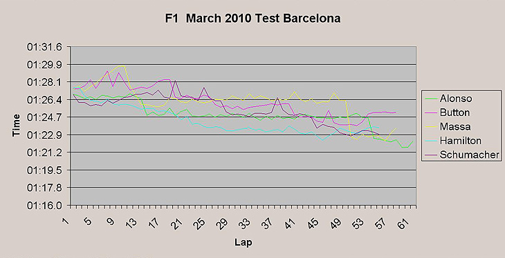 Στo γράφημα, συγκρίνονται οι προσομοιώσεις αγώνα των πρωταγωνιστών από τις τελευταίες ημέρες στη Βαρκελώνη (λαμβάνοντας πάντοτε υπΆ όψη τις διαφορετικές συνθήκες που επικρατούσαν στην πίστα τις τρεις τελευταίες ημέρες): του Alonso (Ferrari) την Παρασκευή, των Massa (Ferrari) και Button το Σάββατο και των Hamilton (McLaren) και Schumacher (Mercedes) την Κυριακή. Aξίζει να σημειωθεί πώς προστατεύει καλύτερα τα ελαστικά του ο Alonso από τον Massa στους πρώτους γύρους των συγκρινόμενων προσομοιώσεων. Όπως επίσης ότι στο μεσαίο stint οι McLaren καταφέρνουν και βελτιώνουν σταδιακά τους χρόνους τους, σε αντίθεση με τις Ferrari που διατηρούν σταθερό ρυθμό στο δεύτερο stint και χαμηλώνουν σημαντικά τους χρόνους τους με το τρίτο σετ ελαστικών. Ο Schumacher από την πλευρά του, παρουσιάζει αρκετούς γύρους όπου οι χρόνοι του είναι πιο αργοί του κανονικού ρυθμού του. Υπενθυμίζουμε ότι ο Button έκανε την προσομοίωσή του στην πρώτη ημέρα χρήσης του καινούργιου αεροδυναμικού πακέτου της McLaren, πριν προλάβουν οι μηχανικοί να στήσουν ιδανικά την ΜΡ4-25 και ότι ο Hamilton έχασε χρόνο κολλημένος πίσω από τον –βαρύτερο- Schumacher στο τελευταίο stint του, εκεί όπου αυξάνονται οι χρόνοι του.