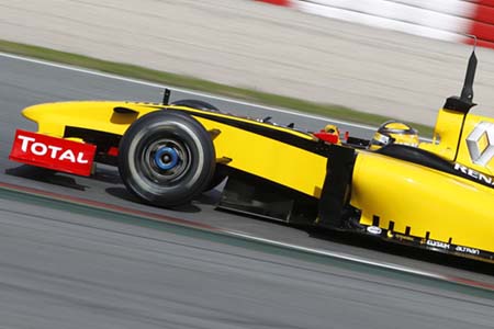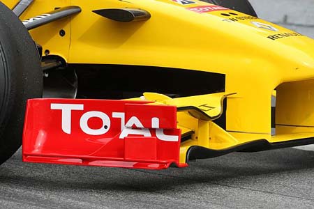 H Renault παρουσίασε σήμερα στη Βαρκελώνη μια καινούργια εμπρός αεροτομή, της οποίας τα ανώτερα στοιχεία παρουσιάζουν ένα έντονο βύθισμα στο εσωτερικό τους μέρος. Το ορθογώνιο πλευρικό τοίχωμα του επάνω στοιχείου προεξέχει από το εμπρός μέρος του διπλού (πλέον) πλευρικού τοιχώματος της αεροτομής. Το πίσω μέρος του πλευρικού τοιχώματος της αεροτομής είναι τοποθετημένο πιο κεντρικά για να παίρνει αέρα από τα εξωτερικά της αεροτομής και να τον διοχετεύει γύρω από τα εμπρός ελαστικά. Επίσης, στην πρόσοψή τους, τα εμπρός (κάτω) βασικά πτερύγια της αεροτομής, ανασηκώνονται στα άκρα τους, δημιουργώντας μια έντονη καμπύλη εκεί που συναντούν το πλευρικό τοίχωμα, παρόμοια με το σχεδιασμό στις εμπρός αεροτομές των Mercedes, Red Bull και Williams.