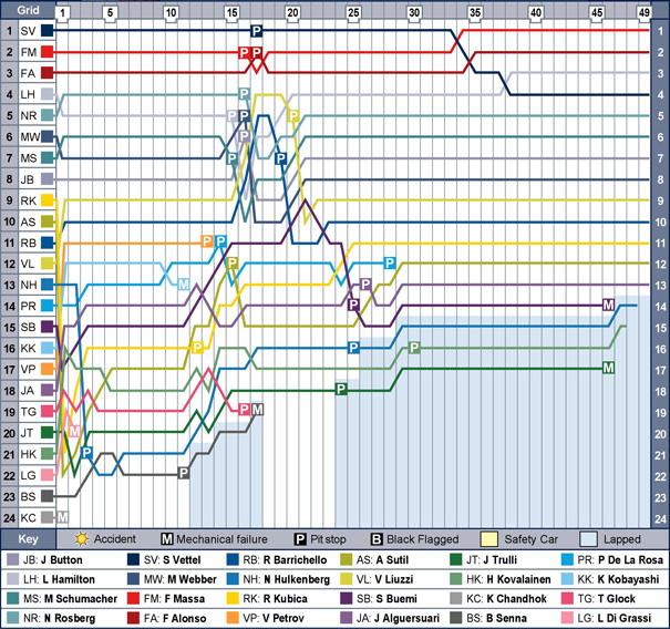 Συνεπώς, η κατάταξη διαμορφώθηκε ως εξής έπειτα από τα pit stop: Vettel, Alonso, Massa, Hamilton, Rosberg, Schumacher, Button και Webber. O Vettel, με τα σκληρά ελαστικά δε μπορούσε πια να απομακρυνθεί πολύ από τον Alonso, ο οποίος μείωνε σταθερά τη διαφορά που τους χώριζε, ενώ παράλληλα, ο Hamilton απομακρυνόταν με ταχείς ρυθμούς από τον Rosberg, αποδεικνύοντας ότι ο Γερμανός τον είχε καθυστερήσει στο πρώτο stint. Ο Alonso δήλωσε μετά τον αγώνα ότι έβλεπε πως ήταν ταχύτερος του Vettel και έχει περίσσευμα δυνατοτήτων στο μονοθέσιό του, περίμενε να επιτεθεί στους τελευταίους 10-12 γύρους.