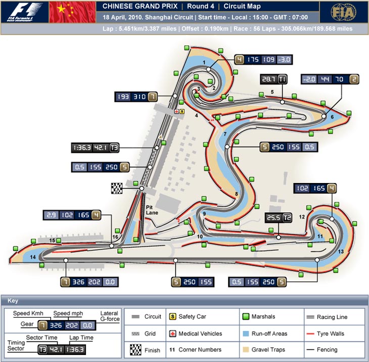 Η πίστα της Shanghai διαθέτει δυο παρατεταμένες στροφές και μερικές πολύ γρήγορες αλλαγές κατεύθυνσης. Αμφότερα τα στοιχεία αυτά φθείρουν τα ελαστικά πάρα πολύ (σε συνδυασμό με τον τραχύ ασφαλτοτάπητα) για αυτό άλλωστε το λόγο η Bridgestone θα έχει στη διάθεση των ομάδων πιο σκληρές γόμες από πέρυσι (τη σκληρή και τη μαλακή). Η χάραξη της πίστας απαιτεί υψηλές τιμές παραγωγής αρνητικής άντωσης, ωστόσο η μεγάλη (μήκους 1,3 χιλιομέτρων) ευθεία κάνει τις ομάδες να ρυθμίζουν τα μονοθέσιά τους λαμβάνοντας υπ' όψη την τελική ταχύτητα. Αυτή βέβαια, εξαρτάται από την ταχύτητα διέλευσης από τη στροφή 13, οπότε ο συμβιβασμός είναι πολύ λεπτός. Υπάρχει πολύ μεγάλη πιθανότητα βροχής την Κυριακή. Βοηθός των αγωνοδικών θα είναι αυτό το σαββατοκύριακο ο Alex Wurz, πρώην πιλότος των Williams και Benetton και δοκιμαστής των McLaren και Honda.