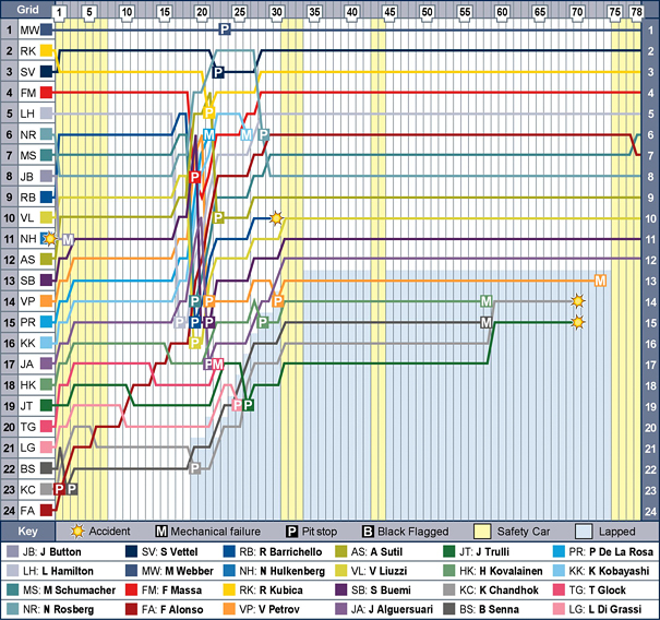 Στην 4η θέση, απ' όπου εκκίνησε, είδε την καρό σημαία ο Felipe Massa, με πίσω του τον Lewis Hamilton, ο οποίος αντιμετώπισε προβλήματα υπέρμετρης φθοράς των φρένων του εμπρός άξονα της McLaren του. Την 6η θέση κατάφερε να κλέψει στην τελευταία στροφή ο Michael Schumacher από τον Fernando Alonso, με την αποχώρηση του αυτοκινήτου ασφαλείας. Ωστόσο, οι αγωνοδίκες (μέλος των οποίων ήταν και o Damon Hill, ένας από τους μεγάλους αντιπάλους του Schumacher), τιμώρησαν με ποινή 20 δευτερολέπτων το Γερμανό, επειδή οι κανονισμοί ορίζουν ότι κανείς δεν έχει το δικαίωμα να προσπεράσει εφόσον το αυτοκίνητο ασφαλείας βρίσκεται στην πίστα στον τελευταίο γύρο και αποχωρεί για το pit lane στο τέλος του. Με την ποινή, ο Schumacher έπεσε στη 12η θέση, τελευταίο δηλαδή από αυτούς που πέρασαν τη γραμμή του τερματισμού, καθώς τα μονοθέσια βρίσκονταν πολύ κοντά μεταξύ τους, όντας πίσω από το αυτοκίνητο ασφαλείας. Εντούτοις, η ομάδα της Mercedes άσκησε έφεση στην απόφαση των αγωνοδικών και το ζήτημα θα αναλάβει να διευθετήσει το Διεθνές Εφετείο της FIA.