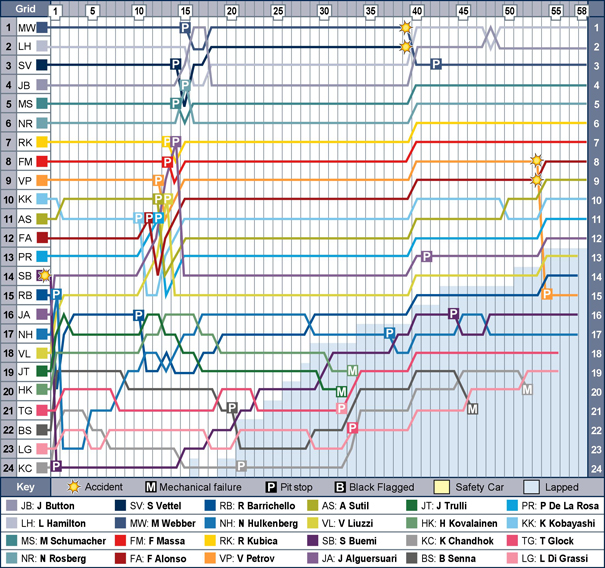 Επρόκειτο για ένα συναρπαστικό Grand Prix, με τέσσερις οδηγούς να μάχονται για τη νίκη και τη δράση να διαρκεί μέχρι τους τελευταίους γύρους. Ωστόσο, στο βάθρο ο μόνος που φαινόταν να χαμογελάει αβίαστα ήταν ο Jenson Button, αφού οι Lewis Hamilton και Mark Webber ήταν εμφανώς κατηφείς, ο καθένας για τους δικούς του λόγους.