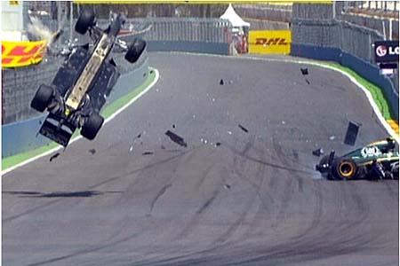 O Webber ήθελε να προσπεράσει άμεσα για να χάσει όσο το δυνατό λιγότερο χρόνο και ο Kovalainen υπερασπιζόταν τη θέση του. Στα φρένα της στροφής 12, ο Φινλανδός κάλυπτε την εσωτερική και ο Webber επιχείρησε να βουτήξει στην εξωτερική, αλλά την ίδια σχεδόν στιγμή, ο Kovalainen πήγε να καλύψει την αγωνιστική γραμμή, ξεκινώντας το φρενάρισμά του για τη στροφή. Το πρόβλημα ήταν ότι το σημείο που ξεκινούσε το φρενάρισμά της η Lotus προηγούνταν αυτού της Red Bull περί τα 80 μέτρα… Βλέποντας την απρόβλεπτη για τον ίδιο επιβράδυνση του προπορευόμενου μονοθεσίου, ο Webber έκανε μια απέλπιδα προσπάθεια να βγει από το slipstreaming της Lotus από την εσωτερική, αλλά απλά δεν υπήρχε αρκετός χώρος Η Red Bull του Αυστραλού απογειώθηκε με 308 χ.α.ώ. ανυψώθηκε στα πέντε μέτρα (παρασέρνοντας μια διαφημιστική πινακίδα) και προσγειώθηκε ανάποδα στην πίστα, ωστόσο η ορμή της ταχύτητας που είχε αναπτύξει παρέσυρε το μονοθέσιο προς τα εμπρός, για να προσκρούσει στη συνέχεια, με περίπου 145 χ.α.ώ. μετωπικά στα προστατευτικά ελαστικά της -ευτυχώς- ευρύχωρης περιοχής διαφυγής. Στο ατύχημα ενδέχεται να συνέβαλε και το γεγονός ότι ο Webber χρησιμοποιούσε εκείνη τη στιγμή το σύστημα stalling πίσω αεροτομής, το οποίο στα μονοθέσια της Red Bull απαιτεί από τους οδηγούς της να απομακρύνουν το αριστερό τους χέρι από το τιμόνι για να το ενεργοποιήσουν.