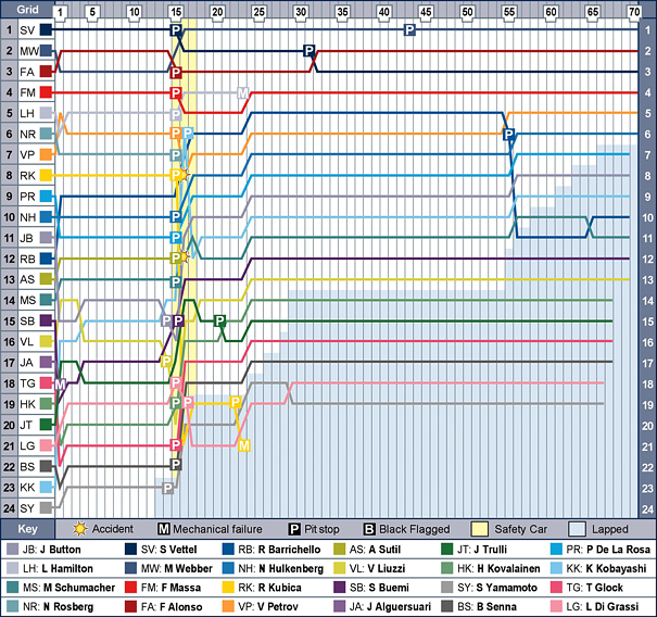 αρκετούς βαθμούς για τη Renault, σε μια ημέρα που ένα λάθος του σηματωρού της στα pit stop, προκάλεσε τη σύγκρουση του Robert Kubica με τον Adrian Sutil εντός του pit lane, όταν σχεδόν όλοι οι οδηγοί έσπευσαν στα pits, μόλις το αυτοκίνητο ασφαλείας έκανε την είσοδό του στην πίστα.