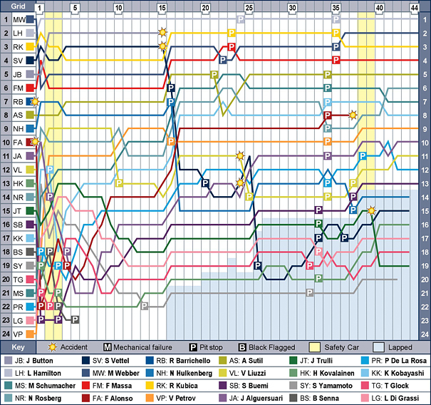 Ο Hamilton είδε και πάλι τη διαφορά που είχε αναπτύξει από τον Webber να μηδενίζεται και η επανεκκίνηση στον 41ο από τους 44 γύρους ήταν η τελευταία ευκαιρία του Αυστραλού να διεκδικήσει τη νίκη. Ωστόσο, για μια ακόμα φορά σήμερα, ο Hamilton έκανε τα πάντα σωστά και δεν άφησε περιθώρια στη Red Bull να τον απειλήσει. Με τον ίδιο τρόπο, ο Kubica δεν είχε τη δυνατότητα να απειλήσει τον Webber, διατηρώντας παράλληλα μια απόσταση ασφαλείας από τον Massa.