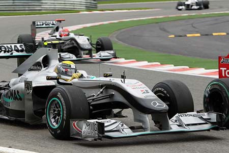 Στο 11ο γύρο, αφού οι Rosberg, Petrov και Schumacher κατάφεραν να περάσουν εμπρός από τον Liuzzi που τους καθυστερούσε, ο Ρώσος οδηγός της Renault προσπέρασε από την εξωτερική τον Rosberg στη Les Combes. O Schumacher επωφελήθηκε της κατάστασης και