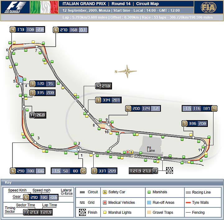 Η πίστα: Monza Το Autodromo Nazionale di Monza φέρει το προσωνύμιο «ναός της ταχύτητας» και όχι άδικα, καθώς αποτελεί τον ταχύτερο σταθμό του Πρωταθλήματος της Formula 1, με τις μέσες ωριαίες να φτάνουν τα 250 χ.α.ώ. και τις τελικές τα 350! Για αυτό το λόγο, όλες σχεδόν οι ομάδες προετοιμάζουν αποκλειστικά για αυτό τον αγώνα ειδικές αεροτομές (εμπρός και πίσω) με πτερύγια που παρουσιάζουν σχεδόν μηδενική γωνία πρόσπτωσης -είναι δηλαδή σχεδόν οριζόντια-, ώστε να παράγουν πολύ χαμηλές τιμές αρνητικής άντωσης και όσο το δυνατό λιγότερη αεροδυναμική αντίσταση. Η ταχύτητα στις ευθείες είναι ένας από τους βασικότερους παράγοντες για την επίτευξη ανταγωνιστικών χρόνων στο γύρο, αλλά όχι ο μοναδικός. Στη χάραξη της Monza υπάρχουν μερικές γρήγορες στροφές (το δίδυμο των Lesmo και η Parabolica), όπου λόγω των χαμηλών τιμών παραγωγής αρνητικής άντωσης, τα μονοθέσια γλιστράνε πολύ περισσότερο από το συνηθισμένο. Συνεπώς, είναι πολύ δύσκολο να ισορροπηθούν κατά το στήσιμο οι διαφορετικές απαιτήσεις ευθειών/στροφών. Επιπλέον, η Monza παρουσιάζει τρία αργά chicane (Rettifilio, Roggia και Ascari), όπου απαιτούνται μαλακές ρυθμίσεις, οι οποίες θα επιτρέπουν στους οδηγούς να «καβαλάνε» τα kerb, «ισιώνοντας» όσο το δυνατό περισσότερο την τροχιά τους κατά το πέρασμα από αυτά, αν και το έργο αυτό γίνεται πολύ πιο δύσκολο από το γεγονός ότι η απόσταση του πατώματος από το έδαφος που επιλέγεται από τους μηχανικούς είναι μικρότερη από το σύνηθες. Επίσης, οι αναπηδήσεις στα kerb καταπονούν τα μηχανικά μέρη του μονοθεσίου (όπως τις αντλίες νερού ή λαδιού), για αυτό και από κάποιο σημείο του αγώνα και έπειτα, οι οδηγοί πρέπει να είναι πιο προσεκτικοί και συντηρητικοί στο πέρασμά τους από αυτά. Oι μαλακές ρυθμίσεις οδηγούν σε αστάθεια κατά τα φρεναρίσματα, που αποτελούν έναν ακόμα πολύ σημαντικό παράγοντα στο «χτίσιμο» του ιδανικού γύρου, και το φαινόμενο αυτό πολλαπλασιάζεται από την έλλειψη αρνητικής άντωσης. Τα συστήματα πέδησης δοκιμάζονται στο απόλυτο όριο, καθώς η Monza είναι η πιο απαιτητική πίστα από τα φρένα, μαζί με αυτή του Μόντρεαλ στον Καναδά, για αυτό και θα δούμε υπερμεγέθεις αεραγωγούς στο εσωτερικό των πλημνών των τροχών, ενώ οι ομάδες θα προσέξουν πάρα πολύ την κατανομή βαρών για να βελτιώσουν την απόδοση των μονοθεσίων τους κατά την πέδηση. Οι οδηγοί μπορούν να κερδίσουν αρκετό χρόνο με σωστά φρεναρίσματα, ωστόσο, όπως αναφέρει χαρακτηριστικά ο Fernando Alonso, αν φρενάρεις πέντε μέτρα πιο αργά μπορείς να κερδίσεις δυο δέκατα του δευτερολέπτου, αλλά αν φρενάρεις έξι μέτρα πιο αργά βγαίνεις εκτός πίστας. Οπότε η ακρίβεια στα φρένα είναι υψίστης σημασίας, αφού με καλή σταθερότητα στο φρενάρισμα μπορεί κανείς να είναι γρήγορος, ακόμα και αν δεν αναπτύσσει την πιο υψηλή τελική ταχύτητα στις ευθείες. Η μηχανική πρόσφυση αποτελεί ένα ακόμα σημαντικό στοιχείο, καθώς απαιτείται καλή έξοδος από τις αργές στροφές. Οι κινητήρες δοκιμάζονται και αυτοί στο όριο, αφού το 73% του γύρου διανύεται με τέρμα γκάζι και οι 8κύλινδρες μονάδες καταπονούνται σημαντικά, για αυτό και είναι προτιμότερο να μην έχουν χρησιμοποιηθεί ξανά. Οι μεγάλες ευθείες επηρεάζουν και τη συμπεριφορά των ελαστικών, τα οποία παρά το ότι δεν υπόκεινται σε πολύ υψηλές φορτίσεις καταπονούνται αρκετά, για αυτό και η Bridgestone θα παρέχει τη σκληρή και την μαλακή γόμα της. Πολύ χαμηλές πιέσεις ελαστικών επιφέρουν επιπλέον αντίσταση κύλισης, αυξάνοντας τις 