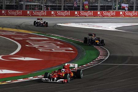 Ο Fernando Alonso έκανε τα πάντα στην εντέλεια στη Σιγκαπούρη, κατακτώντας νίκη, pole position, σημειώνοντας τον ταχύτερο γύρο και παραμένοντας επικεφαλής σε όλους τους γύρους του αγώνα, παρά το γεγονός ότι η Red Bull ήταν ταχύτερη στην πίστα της Marina Bay από τη Ferrari. Oι δυο οδηγοί της Red Bull συμπλήρωσαν το βάθρο, με τον Sebastian Vettel να έχει καταδιώξει τον Alonso καθ’ όλη τη διάρκεια του αγώνα, χωρίς να καταφέρει να περάσει μπροστά του, αφού η ομάδα του επέλεξε να πραγματοποιήσει το pit stop του στον ίδιο γύρο με της Ferrari. O Mark Webber ανέβηκε στο τρίτο σκαλί του βάθρου έχοντας ακολουθήσει μια ριψοκίνδυνη στρατηγική, η οποία απέδωσε εντέλει, που τον είδε να μπαίνει στα pits για αλλαγή ελαστικών στον τρίτο μόλις γύρο, κατά την πρώτη επέμβαση του αυτοκινήτου ασφαλείας. Επιπλέον, η Red Bull του Aυστραλού επιβίωσε από μια αρκετά δυνατή σύγκρουση με τον Lewis Hamilton, η οποία έθεσε εκτός αγώνα τον Βρετανό οδηγό της McLaren, στη δεύτερη συνεχόμενη εγκατάλειψή του από επαφή με άλλο μονοθέσιο...