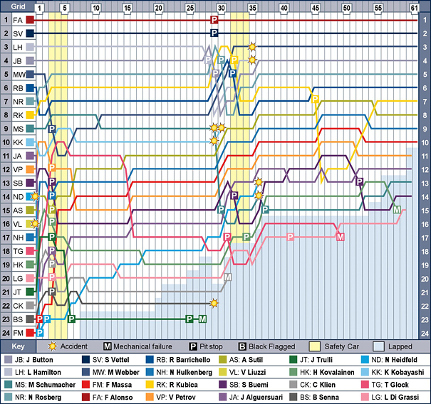 Ακόμα και κατά τη δεύτερη επέμβαση του αυτοκινήτου ασφαλείας, όταν οι διαφορές μηδενίστηκαν, οι Alonso και Vettel είχαν τη δυνατότητα να απομακρυνθούν με ευκολία από τον Webber με τη δεύτερη Red Bull, αν και τα ελαστικά του Αυστραλού είχαν ήδη διανύσει περισσότερους από 30 γύρους, τη στιγμή που των δυο διεκδικητών της νίκης ήταν καινούργια.