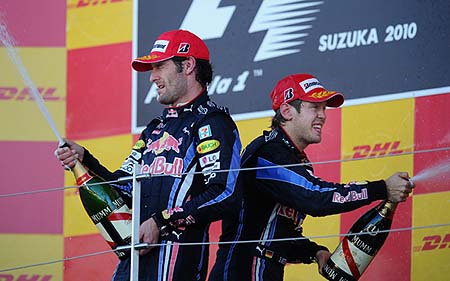 Παρά το γεγονός ότι η αντιπαλότητα μεταξύ των δυο οδηγών της Red Bull έχει αποτελέσει το επίκεντρο των επικεφαλίδων αρκετές φορές νωρίτερα στη σεζόν, στην Ιαπωνία δεν υπήρχαν ιδιαίτερα εμφανή σημάδια της. Ο Webber δήλωσε ότι από τον 9ο γύρο του αγώνα, οι δυο Red Bull πήγαιναν «σε σχηματισμό» χωρίς να επιτίθεται η μια στην άλλη. Η διαφορά των 68 μόλις χλστ. του δλ. που είχε η επίδοση του Vettel από αυτή του Webber στις κατατακτήριες δοκιμές, ήταν ουσιαστικά αυτή που κόστισε τη νίκη στον Αυστραλό, καθώς τα προσπεράσματα σε μια πίστα σαν τη Suzuka με ισοδύναμα μονοθέσια είναι ουσιαστικά αδύνατα. Η μόνη μονομαχία που υπήρξε εντέλει μεταξύ τους, προέκυψε στους τρεις τελευταίους γύρους, όταν ο Vettel προσπάθησε και πάλι να συλλέξει τον ταχύτερο γύρο, αλλά ο Webber του αρνήθηκε τη χαρά στο τελευταίο πέρασμα. Σίγουρα, το γεγονός ότι οι δυο οδηγοί της Red Bull πίεζαν στο όριο στους τελευταίους γύρους χωρίς προφανή λόγο, καθώς βρίσκονταν στις δυο πρώτες θέσεις και δεν τους πίεζε κανείς, πρέπει να δημιούργησε αρκετά τεταμένα νεύρα στο pit wall της ομάδας. «Δε μπορούσα να τον αφήσω να κάνει full house» ήταν το σχόλιο του Webber που δανείστηκε έναν όρο του πόκερ για να χαρακτηρίσει αυτή την άτυπη μονομαχία.
