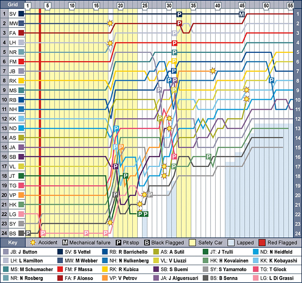 Ο διευθυντής της Red Bull, Christian Horner, δήλωσε ότι η ομάδα του έκανε ένα πολύ ωραίο δώρο στον Fernando Alonso, ο οποίος είχε τονίσει εχθές ότι η προτεραιότητά του είναι να τερματίσει. Λίγοι θα πίστευαν πόσο προφητικά ήταν τα λόγια του. Αφότου απέφυγε τον Webber όταν ο Αυστραλός είχε το ατύχημά του, ο Alonso δεν άφησε τον Vettel να απομακρυνθεί πολύ. Υπό το καθεστώς αυτοκινήτου ασφαλείας στο μέσο του αγώνα, καθυστέρησε ένα γύρο, όπως και ο Vettel, να μπει στα pits.