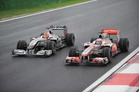 Ο Schumacher επιτίθεται στον Button κατά τη διάρκεια των πρώτων γύρων.