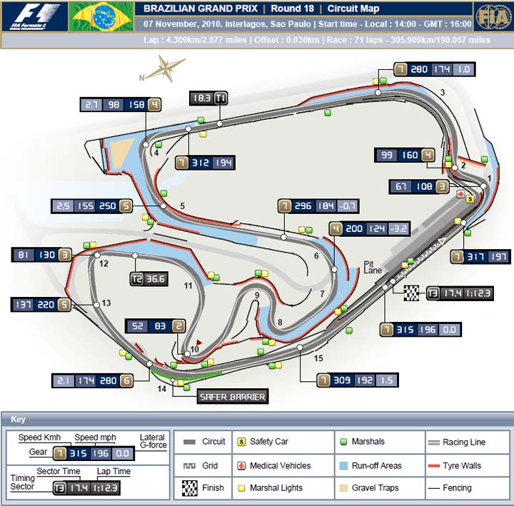 Φέτος, με τα συστήματα stalling πίσω αεροτομής, οι ομάδες θα έχουν τη δυνατότητα να στήσουν τα μονοθέσιά τους έτσι ώστε να αποδίδουν καλά στο εσωτερικό, αργό κομμάτι, «ξεφορτώνοντας» την επιπλέον αρνητική άντωση στις ευθείες. Στο τέλος της μεγάλης ευθείας υπάρχει μια μεγάλη ευκαιρία για προσπέρασμα, στα φρένα για την «S do Senna» (1ο σύμπλεγμα στροφών). Για αυτό το λόγο, η έξοδος από την τελευταία πραγματική στροφή, την Juncao (12), είναι κρίσιμης σημασίας.