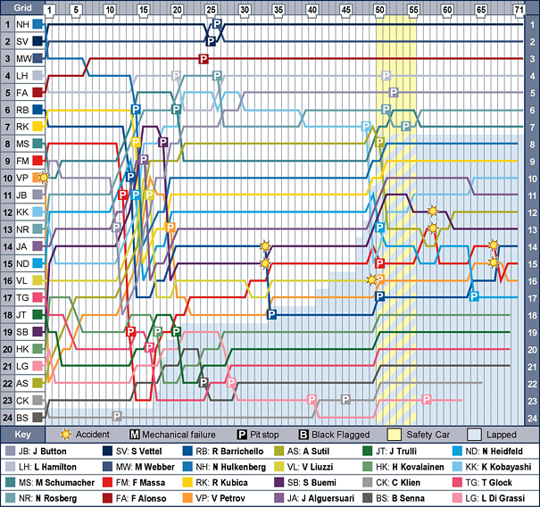 O Vettel είχε προλάβει να δώσει γύρο στους Hulkenberg και Kubica πριν το κάνει και ο Webber, oπότε τα δυο μονοθέσια παρέμειναν μεταξύ τους υπό το καθεστώς αυτοκινήτου ασφαλείας. Ο Vettel είχε διατηρήσει τα ελαστικά του σε καλή κατάσταση και έπειτα από την επιστροφή του αυτοκινήτου ασφαλείας στα pits, εκμεταλλεύτηκε το περιθώριο που είχε αφήσει, για να αυξήσει τη διαφορά του από την άλλη Red Bull έως τα 5 δλ. Την ίδια στιγμή, ο Webber αντιμετώπιζε προβλήματα υπερθέρμανσης με τον κινητήρα του και αναγκάστηκε να μειώσει την απόδοσή του 8κύλινδρου Renault για να κατεβάσει τη θερμοκρασία λειτουργίας του. Μονάχα στους δυο τελευταίους γύρους του δόθηκε η άδεια από το pit wall της Red Bull να πιέσει όσο θέλει.