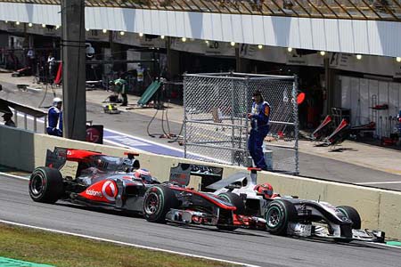 Από την πλευρά του, ο Button, κέρδισε δυο θέσεις στην εκκίνηση, αλλά ο Schumacher κατάφερε να τον προσπεράσει ξανά. Βλέποντας τον οδηγό της παγιδευμένο στη 10η θέση, η McLaren τον έφερε στα pits στο τέλος του 11ου γύρου. Η Ferrari απάντησε στον επόμενο γύρο με τον Massa (8ος μέχρι τότε), ωστόσο ο Button πέρασε… γύρω από τον Βραζιλιάνο καθώς αυτός έβγαινε από τα pits. Οι πρώην προπορευόμενοι του Button, όταν επέστρεφαν από τα pits στην πίστα βρίσκονταν πίσω του, επειδή ο Βρετανός είχε βρεθεί σε καθαρό αέρα με καινούργια ελαστικά. Συνεπώς, οι δυο McLaren βρέθηκαν η μια πίσω απ’ την άλλη, καθώς ο Hamilton επέστρεψε στην πίστα έπειτα από το δικό του pit stop (εκπληκτικά βολικά…) ακριβώς μπροστά από τον team mate του.