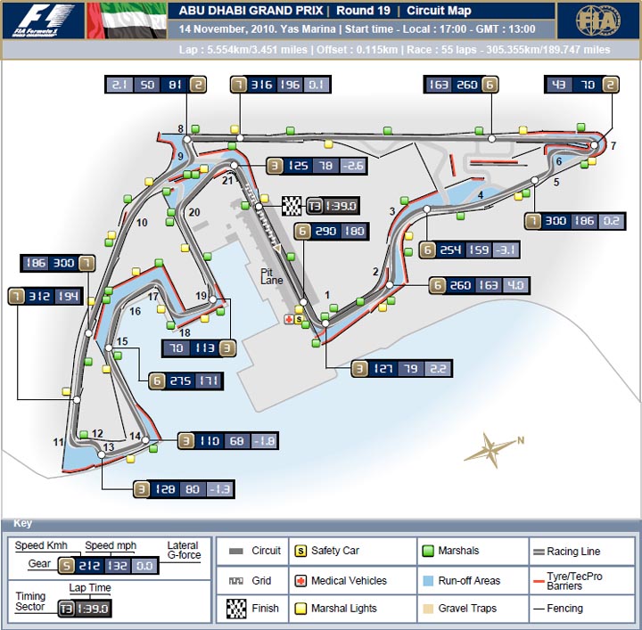 Οι εικόνες από το Αμπού Ντάμπι μοιάζουν με ταινία επιστημονικής φαντασίας, όπου όλα εκτυλίσσονται στο μέλλον, σε μια ήσυχη γωνιά του… πλανήτη Άρη! H πίστα της Yas Marina, έχει πάρει το όνομά της από τη μαρίνα όπου προσαράζουν τα γιοτ των VIP, στο τεχνητό νησί Yas, στην ανάπτυξη του οποίου έχουν επενδυθεί 36 δισεκατομμύρια δολάρια. Πρόκειται για την πιο ακριβή (και λουσάτη) πίστα του κόσμου, καθώς η κατασκευή της κόστισε 900 εκατομμύρια ευρώ! Το ξενοδοχείο που αλλάζει χρώματα και περνάει επάνω από την πίστα αποτελεί υπογραφή της, όπως και το πολύ στενό τούνελ στην έξοδο του pit lane, που περνάει κάτω από την πίστα και επικρίθηκε πέρυσι από τους οδηγούς. Είναι πολύ στενό και οι οδηγοί είναι αναγκασμένοι να το διανύουν με πολύ λίγα χιλιόμετρα, χωρίς πραγματική πρόσφυση (ενώ στρίβουν). Επιπλέον, αν συμβεί ένα ατύχημα εκεί, είναι πολύ πιθανό να μπλοκάρει η έξοδος και θα είναι δύσκολο να απομακρυνθούν τα ακινητοποιημένα μονοθέσια.